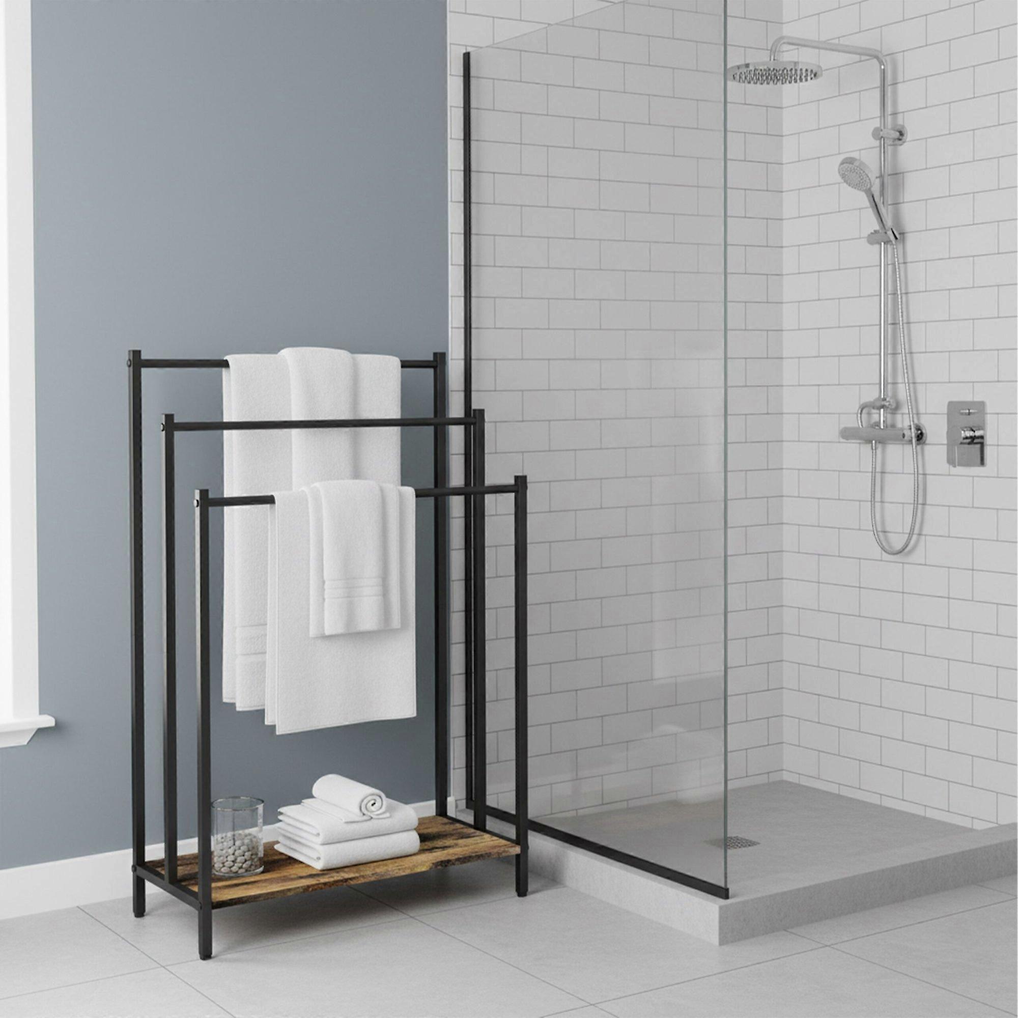 Optimera ditt badrumsutrymme med detta mångsidiga handduksställ med hyllplan för extra förvaring. Den fristående designen möjliggör enkel placering, medan förskjutna stänger säkerställer snabbare handdukstorkning. Maximera utrymmet med ett fristående handduksställ perfekt för badrum eller gästtoaletter. Förbättra torkeffektiviteten med tre förskjutna stänger som främjar luftcirkulationen. Förvara nödvändigheter på den integrerade hyllplanen, perfekt för handdukar, tofflor och mer. Njut av ett elegant utseende med en dekorativ metallram och träeffekt. Förvandla ditt badrum till en organiserad oas med detta funktionella och snygga handduksställ. Dess enkla placering och effektiva design gör det till ett måste i alla hem. Köp din idag. Specifikationer Material: Metallram med träeffekt Design: Fristående med tre förskjutna stänger